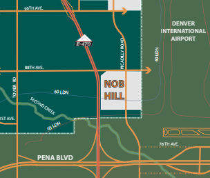 Located five minutes from the airport’s front door, Nob Hill’s immediate visibility and access to DIA make this a prime privately held piece of property. Sharing boundaries immediately at DIA’s western border and Pena Boulevard, the site offers unique views both back to DIA’s iconic terminal and also to the Colorado Rockies and downtown Denver. Nob Hill has a unique access point to the western gate of DIA with the potential of securitized access to DIA’s western airfield and the renewable energy sector of DIA as well as quick access to DIA’s current car rental and air cargo facilities. Nob Hill is a premier location for airport conference/ hospitality, airport technology businesses, support services to DIA, flex-tech and retail. Current access is available to the site at 88th and E-470 with additional future access provided as part of the aerotropolis development plan.